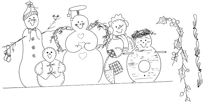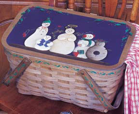 | Preparation The basket comes already stained. Tape off the edges of the lid with 3/4” wide magic tape. Basecoat insert with Deep Midnight Blue. Transfer pattern. Shelf: Basecoat with Burnt Umber, highlight along the top edge with Sable Brown. Wood graining is fine lines of Bittersweet Chocolate with a touch of Black. Add a few light lines in Sable Brown. Tall Snowman on Left 1. Basecoat snowman in Antique White, highlight on the left side with Buttermilk. Basecoat hat with Mistletoe, shade with Black Forest Green, highlight with Bright Green. The stripes on the brim are Bright Green with a touch of White Wash. the arm branches are Bittersweet Chocolate, highlighted here and there with touches of Sable Brown and Yellow Ochre. 2. The ties around the snowman’s neck and on his cap are True Red highlighted with Cadmium Red. The nose is Burnt Orange, shaded next to the face with Burnt Umber. The eyes, mouth and snap buttons are Black. 3. When the face features are dry, wet the entire face with clean water, dab a small amount of True Red plus White in cheek area. Using a small Mop Brush, soften out blush area. 4. The cardinal is True Red with a Black face. The beak and feet are Marigold. 5. The mittens are Country Red. Shade Country Red with a touch of Black Forest Green. Highlight with True Red. The mitten string is Neutral Grey, highlighted here and there with a touch of White Wash. Angel Snowman 1. Basecoat snowman Antique White, shade with Sable Brown and highlight with Buttermilk. The crosshatching cloth lines are a mix of Sable Brown and Antique White. 2. The eyes, nose, mouth and stitched hearts are Black. 3. The branches for the wings are thin lines of Sable Brown, Burnt Umber, Yellow Ochre and Bittersweet Chocolate. The dried leaves are small one-strokes of Yellow Ochre and Antique White. Berries are dots of Country Red. 4. The halo is Marigold, shaded with Burnt Sienna and highlighted with White Wash. the string hanging from the halo is Neutral Grey highlighted with White Wash. Stars are marigold, shaded on the right with Burnt Sienna and highlighted on the left with White Wash. Short Snowman 1. Basecoat snowman in Light Buttermilk, shade with neutral Grey and highlight with White Wash. 2. The vest is Sapphire, shaded with Deep Midnight Blue next to the arms. Highlight the edges with a mix of Sapphire and a little White Wash. The plaid stripes are White Wash. The buttons are Marigold, shaded with a line of Burnt Sienna on the right and a highlight dot of White Wash on the left. 3. The nose is Country Red with a dot of White Wash to highlight. The eyes, mouth and all stitching lines are Black. Patchwork Snowman 1. Basecoat snowman in Desert Sand. Shade the left side, above and below arm, next to tummy, and next to birdhouse snowman with a soft float of Neutral Grey. Highlight the right side and edges of arms and tummy with a float of Buttermilk. 2. One square on the bottom section of snowman and scarf are both basecoated in Forest Green, shaded with Black Forest Green, and highlighted with Mistletoe. Stripes on the scarf are White and plaid lines on the square are lines of White Wash and Country Red. The other square and earmuffs are basecoated in Country Red, shaded with Charcoal Grey and highlighted with True Red. Dots on the square are White Wash. 3. Basecoat patchwork square on the arm in Buttermilk. The checks are Country Red. Shade along edge of arm with a soft float of Charcoal Grey. All stitching is done in Black. 4. The nose is Burnt Orange, shaded next to the face with a touch of Burnt Umber. The eyes and mouth are Black. The earmuff wire is Neutral Grey, highlighted here and there with a touch of White Wash. Birdhouse Snowman 1. Basecoat snowman in Khaki Tan, shade with Bittersweet Chocolate and highlight with Desert Sand. 2. The wood graining is thin lines of Bittersweet Chocolate with a touch of Black. Add a few light lines in Desert Sand. The hole is Charcoal Grey, shaded on the left with Black. The perch is a dot of Burnt Umber. The stick arms are Burnt Umber, shaded next to the body with Bittersweet Chocolate and highlighted on the tips with Sable Brown. The nest cap is thin lines of all the browns on your palette. 3. The female cardinal is first basecoated in Burnt Umber and then highlighted with Country Red and a few brighter strokes of True Red. Add a few Forest Green one-stroke leaves and tiny dot True Red berries. Trim 1. Basecoat berries in the top corners in Country Red. Shade with a mix of Country Red and a touch of Black Forest Green. Highlight with True Red and a tiny “glisten” dot of White Wash. 2. Basecoat holly leaves Forest Green, shade with Black Forest Green and highlight with a mix of Mistletoe and Bright Green. Vein lines are the highlight mix plus a touch of White Wash. 3. Branches are Burnt Umber highlighted here and there with a touch of Sable Brown. Add a few small one-stroke leaves in a double load of Forest Green and Mistletoe. 4. Strokes on the handles are Forest Green with a touch of Mistletoe. Dots are Country Red. Finishing Instructions Let basket dry completely and varnish with three coats of Varnish. |