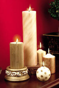 Heavenly Hues are transparent color washes that allow one-step decorating for wood, ceramic bisque, or plaster. Simply apply paint and then wipe off excess. When used as a wash over opaque Americana acrylics, the result is the added depth of an antique finish. Candle Painting Medium, when mixed with acrylic paint, allows the paint to adhere to candles. It keeps the paint from crawling or separating. Preparation Clean candles with rubbing alcohol. Instructions Note: Mix all paint 1:1 with Candle Painting Medium. Round Candle Dip Easy Cling pouncer into Heavenly Gold and press dots onto candle. Short Striped Candle Place vertical strips of tape on candle. Use small piece of sponge to pounce Heavenly Gold on open areas. Carefully lift tape off candle while paint is still wet. Ribbed Use #10 brush to apply Heavenly Gold, leaving heavier deposits in the ribbed areas. Short Pillar with Checks 1. Mix Beautiful Burgundy with Heavenly Gold. Sponge on candle sides. 2. Use #6 flat brush to paint Heavenly Gold checks all around candle. 12" Pillar Use #10 brush to lightly alternate application of Heavenly Gold and Beautiful Burgundy in a diagonal direction on the candle sides. Plaster Candle Holders Note: Do not mix paint with Candle Painting Medium. 1. For round holder, use #10 brush to apply Heavenly Gold with moistened sponge, wipe paint off, leaving color onto in recessed areas. 2. For square holder, use #10 brush to apply Heavenly Gold on entire piece. Allow to dry, then spray with Americana Matte spray. When dry, apply Beautiful Burgundy. Use moistened sponge to wipe off excess color. 3. Finish plaster pieces by spraying with Americana Matte Spray. Designer: Teri Stillwaugh |