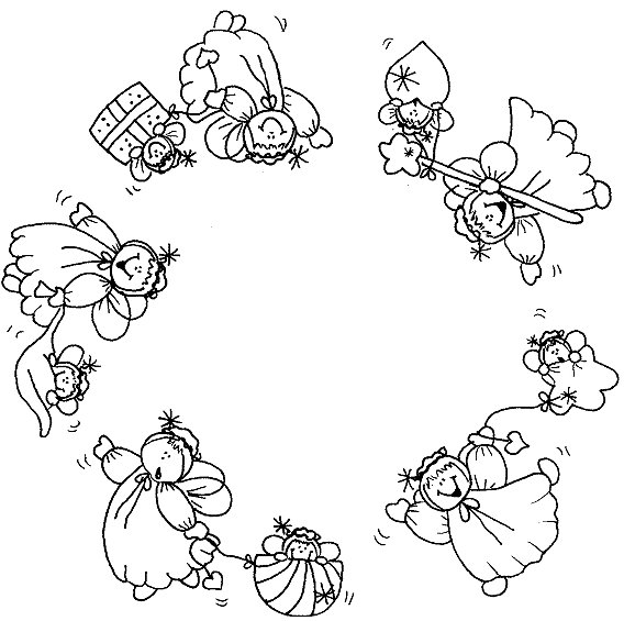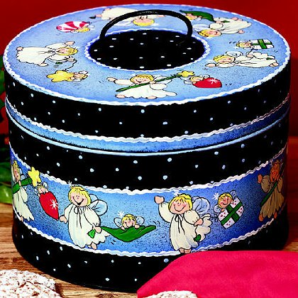 | PREPARATION 1. If using a tin other than the one specified, clean surface with vinegar and apply Coal Black basecoat. 2. Trace patterns. 3. Place masking tape along top border edge of lid sides. Place lid on can. Place another length of tape around can, just below lid edge. Place last length of tape around bottom edge of can side. PAINTING INSTRUCTIONS Helpful Hints: To add shading, use Clear Medium to float shading color around border edges where instructed, using wash/glaze brush. To sponge paint, dip slightly dampened sponge square into paint, tap onto palette and gently apply color with pouncing motion. Allow paint to dry between coats. 1. Sponge background around top of lid with Soft Blue, leaving 3-1/2" circle unpainted around lid handle. Repeat around sides of lid and can. Use wash/glaze brush and Clear Medium to float border edges of background areas with Bright Blue. When dry, remove tape. 2. Dip stylus into Soft Blue to create random dots. 3. Basecoat angels’ faces, hands and feet Light Apricot. Dip #2 round brush into Real Red, onto palette and apply to cheeks. Use #1 liner to add tiny Real Red noses, Coal Black eyes and inner mouth areas. Use #18/0 liner to add Bright White highlight dots on cheeks. Paint hair Sunlight Yellow. Use filbert to paint gowns Ivory. Dip angular shader in Clear Medium, load tip of brush with Bright White. Float color along border edges of wings. Use #1 liner for Bright White halo starbursts. 4. Basecoat stars Sunlight Yellow. Use #2 round brush to add touch of Bright Orange shading around star tips. Add Bright White starburst highlight with #1 liner. Paint tiny heart at end of handle string with True Green. 5. Basecoat floating leaf and stick for star True Green. Use #5 round brush to add Bright Lime Green highlights along upper leaf lines. Use #2 round brush to paint Bright Lime Green highlight line on stick. 6. Basecoat floating package Bright White; float around border edges with Soft Blue. Paint ribbon True Green; add Bright Lime Green highlights with #2 round brush. Use stylus or #1 liner brush to add Real Red dots on package. Paint tiny heart on handle string with True Green. 7. Paint candy Bright White; float border edges with Soft Blue. Paint strips Real Red. Use #1 liner to add Bright White highlight line and starburst. Paint heart on handle string True Green, using #2 round brush. 8. Basecoat floating heart Bright White. Paint heart with two coats of Real Red. Use #1 liner to add Bright White starburst highlight. 9. Add Clear Medium to Coal Black for outlines and detail with #18/0 liner. 10. Use #5 round brush, add Bright White squiggly lines to separate sponged areas from background. |