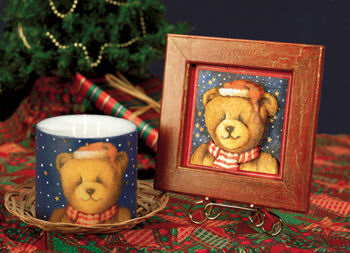 Helpful hint: To get more depth in the picture, use more napkin designs. 1. Separate the top printed ply from each of six napkin designs. 2. Apply Clear Coat to inside area of the frame with the 3/4” brush. Adhere one entire napkin design to wet surface (trim to fit, if necessary) and apply another layer of Clear Coat, brushing from the center to eliminate wrinkles and bubbles. Let dry. 3. From one napkin design, cut all of the bear, including the shoulders, away from the background. From a second napkin design, cut the entire head, including the hat and scarf, but not the shoulders. From a third napkin design, cut only the hat. From a fourth napkin design, cut the round nose area, and from the fifth napkin design, cut only the nose and mouth. 4. Adhere each cut-out to a piece of card stock, following instructions in Step 2. When dry, trim card stock so that none shows. PAINTING INSTRUCTIONS 1. Paint the frame with Glorious Gold, using #12 shader. Let dry. 2. Use #10 shader to apply a coat of Weathered Wood; let dry. 3. With #12 shader, add a coat of Napthol Red; let dry. FINISHING INSTRUCTIONS 1. Varnish the frame with DuraClear Satin. 2. Place small dots of silicon on the napkin that’s already adhered to the center, placing the silicon as follows: near the edge of each ear, in center of hat, on either side of head, on either side where neck meets shoulders, and near bottom of shoulder area. 3. Lay the first napkin cut-out (with the most of the bear’s features) on the silicon, being careful not to press down so there will be a gap between the layers. 4. Apply more silicon in areas the second napkin cut-out will cover; apply second napkin cut-out and continue until all cut-outs have been applied, ending with the nose and mouth cut-out. Candle 1. Clean candle with rubbing alcohol; let dry. 2. Mix equal parts Candle Painting Medium and Uniform Blue. Apply to sides of candle with 3/4" glaze brush. 3. Cut out bear design and adhere, following preparation instructions in Step 2 for frame. 4. Add random dots of Titanium White with handle end of 1/2" brush. 5. Cut stars from napkin design and adhere randomly or paint Glorious Gold stars. |