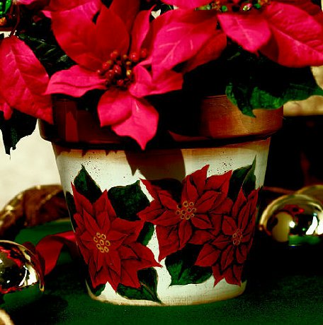 1. Use 3/4” brush to basecoat pot rim Holly Berry Red and pot base Daisy Cream. Let dry. 2. Trace and transfer design. 3. Use #12 flat shader to basecoat leaves Pine Green and poinsettia petals Holly Berry Red. 4. Double load #6 flat shader with Clear Coat and Woodland Brown. Blend on palette. Pull down petal centers to form veins. 5. Double load #6 brush with Clear Coat and Pot O’ Gold. Blend on palette. Highlight leaves and petals. 6. Use liner to outline all with Pot O’ Gold. Paint small Pot O’ Gold circles in flower centers. 7. Use sponge and Pot O’ Gold to antique pot rim. Antique under rim and bottom edge of pot with Woodland Brown. 8. Use old toothbrush to spatter pot base with Woodland Brown. FINISHING INSTRUCTIONS Lightly mist with Americana Matte Spray. |