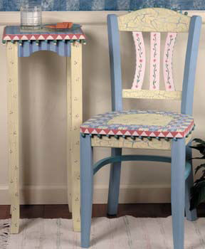 this project.) Painting Instructions Table 1. With 1” flat brush, basecoat table with Whitewash. Let dry. 2. Apply Weathered Wood according to directions. Apply Taffy Cream over Weathered Wood. 3. Using 1” flat brush, paint apron of table Baby Blue with 1/2” vertical stripes spaced 1” apart in Country Blue, using tape to mark off if necessary. 4. On top of table, mark 8” square. In between molding edge and square, paint intersecting 1/2” stripes vertically and horizontally in Country Blue with #6 shader. Let dry. 5. Repeat process with Indian Turquoise, placing intersecting lines adjacent to Country Blue lines. Using Gooseberry Pink, paint narrow, intersecting lines with liner about 1” apart on top of other lines. Then paint dotted lines of Taffy Cream centered on 1/2” lines of Indian Turquoise. 6. With #1 flat brush, paint molding edge Pink Chiffon. Let dry. Using #6 shader with Gooseberry Pink, paint small triangles with the points facing downward around the molding edge. Let dry. 7. With #6 shader, paint 12mm balls Green Mist and 10mm balls Indian Turquoise. Alternating colors, glue balls to underside of molding, centering each one under the downward point of the triangle. 8. Paint 8mm balls Taffy Cream; glue to bottoms of 12mm balls. On legs of table, transfer pattern for rosebuds and paint, using Pink Chiffon. 9. Paint centers with Gooseberry Pink. With script liner, add two leaves on either side of the base of each rosebud using Green Mist. 10. In center of table in square, paint rosebud in center and each corner. Working diagonally, center a rosebud between center and corners. Also place one in the center of each edge side. Connect the rosebuds using diagonal squiggly lines in Green Mist to create diamonds. Paint leaves along edges of green squiggles. 11. Seal surface with DuraClear. Chair 1. Using 1” flat brush, basecoat chair with Baby Blue. Let dry. 2. Apply Weathered Wood, according to directions, to back horizontal slats of chair. Apply Taffy Cream over Weathered Wood. 3. Paint back vertical slats of chair and side edges of seat Pink Chiffon. Let dry. 4. Using #1 script liner and Green Mist, apply a centered vertical squiggly line. Add leaves. 5. Measure 8” square (or size and shape to fit design of chair) in center of seat. Inside square, paint Pink Chiffon roseswith Gooseberry Pink centers. Add two leaves on either side of base of each rosebud using Green Mist. 6. Between molding edge and square, paint intersecting 1/2” squares in checkerboard pattern in Taffy Cream with #1 script liner. Let dry. 7. Using Country Blue, paint 1/2” intersecting lines through the centers of every other square. Repeat this same technique using Indian Turquoise in 1/2” lines, intersecting squares not crossed by Country Blue lines. 8. Dot corners of squares Indian Turquoise. Using Gooseberry Pink, paint 4 short lines radiating out from each dot. 9. Use Pink Chiffon to paint dotted lines down the center of each Country Blue 1/2” line. 10. Using Gooseberry Pink, paint small triangles with points facing downward around seat edge. Let dry. Paint 12mm balls Green Mist and 10mm balls Indian Turquoise. 11. Alternating colors, glue balls to underside of edge of seat, centering each one under the downward point of the triangle. Also glue alternating balls to top of back of chair, and apron under seat. Paint 8mm balls Taffy Cream, glue to bottoms of 12mm balls. 12. Seal with DuraClear. |