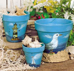 Napkin Décor features ultra-thin designer napkins and DecoArt Mediums, a combination that makes it easy to achieve a hand-painted look on a variety of surfaces. Painting Instructions 1. Using 1" flat brush, paint all terra cotta pots Larkspur Blue, both inside and out, including the drain hole. 2. Mix each of the following colors 1:1 with Clear Coat: Hydrangea Blue, Deep Waterfall Blue and Cloud White. Randomly load the brush with the three colors and apply the water area. 3. Cut designs from napkins and separate printed ply from the rest of the napkin. 4. Place designs on pots and trace around them with a pencil. Remove and paint these areas Cloud White and #12 flat brush. Let dry. 5. Apply Clear Coat to areas where designs will go. Adhere napkin design to wet surface and apply another layer of Clear Coat, brushing from the center to eliminate wrinkles and bubbles. 6. Add clouds with sponge and Cloud White. Paint birds with Wrought Iron Black and #1 liner. 7. Glue 8" pot to bottom of 6" saucer. Apply Outdoor Snow with palette knife around saucer and bottom of pot. Let dry, then paint Antique Mum. 8. Apply Clear Coat to all surfaces. Note: It is recommended that Napkin Décor terra cotta pots be used indoors for decorative purposes, and have a liner to keep the surface dry, as moisture could cause damage to the napkin design. |