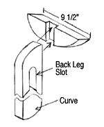 Next, take the back leg piece and round the top of it into a quarter circle (see diagram right). The, cut a 1/2" wide slot in the back leg, from a height of 5 1/2" from the top of the back leg, to a distance of 12" from the top. This slot will be used to attach a sliding connector between the from and back pieces of the frame. Take the Top of Back Leg piece and curve each end. The cut a 1/4" deep groove that is 3/4" wide down the middle of width and attach the back leg (glue and screw). Then, curve the bottom of the back leg, as shown. Finally, attach two brass 1 1/2" long hinges to the Top of Back Leg piece and attach these hinges to the top back support on the front frame (see photo).