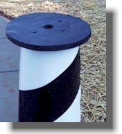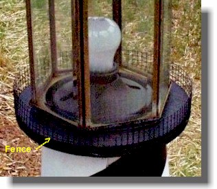 Step 1. It is time to paint your project as you desire. Our spiral black and white pattern is representative of the Cape Hatteras light house. If you plan on painting one like this, then paint the white color first, and let dry. Use masking tape to tape off the spiral, then paint the black stripe. Notice the width of the black spiral is smaller at the top, and grows wider as it goes down. Step 2. Cut 2"x 24" piece from 1/4" hardware cloth, and attach to lighthouse 10" round top. This represents a fence around the top.