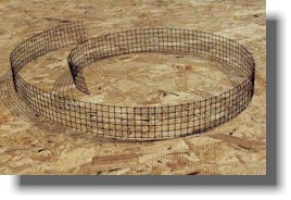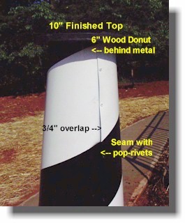 Step 5. Assemble sheet metal sides.... Carefully pre-bend two halves of sheet metal into a curve. Trim excess to form curve at points A - B - C as shown on "Sheet Metal Side View" drawing above. Pre-drill holes and fasten sheet metal to top and bottom wood donuts with small nails or screws. (These fasteners will show, so choose accordingly)