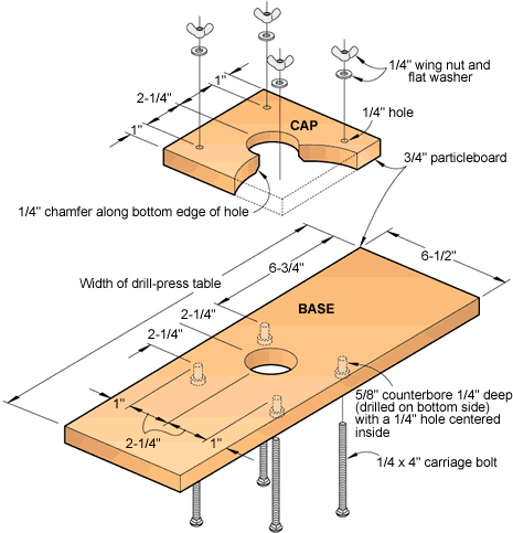 Drill the counterbored holes for the carriage bolts and the large holes in the base and cap. (See the Jig Hole Guide at right.) Insert the bolts, and center the jig by lowering the bit back into the hole and holding it there while you clamp the jig to your drill-press table. Place the ball over the hole, slide the cap down on the protruding carriage bolts, and tighten it onto the ball with washers and wing nuts. Chuck in the proper bit and drill away.