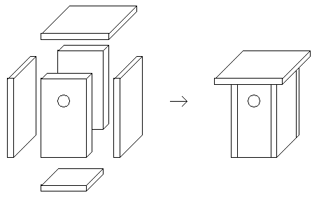 Before getting to the instructions, here is a quick overview of the project. The goal is to assemble a kit that allows a typical 8- to 12-year old to successfully build and paint a birdhouse in a single meeting, and have fun doing it. The kit goes together like this: