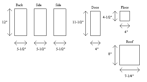 Each kit consists of a roof, a floor, a front door, a back and two sides. The two sides and the back are 12-inch long pieces of 1 x 6. The roof is an 8-inch long piece of 1 x 8. The door is an 11.5 inch piece of 1 x 6 ripped down to 4 inches wide. The floor is a 4.5-inch piece of 1 x 6 also ripped down to 4 inches wide. The exact dimensions of the six pieces are shown below: