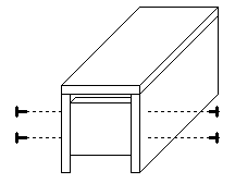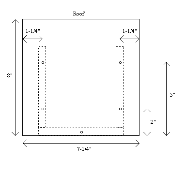 Drill 5 holes in the roof piece. In the picture below, the dotted lines represent where the side and back pieces will lie when the roof is in place. The hole in the back center should be 3/8" away from the edge and centered.