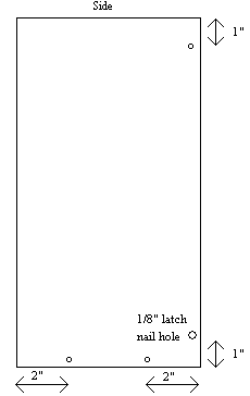 Finally, with your 1/8" (or better yet 3/32" if you have it) bit you need to drill a "latch hole" in the side pieces of the house. This bird house uses two "latch nails" to hold the door shut. You want to drill a hole through the side and into the door for this latch nail to go into. You want the hole to be big enough for the nail to be finger tight, but preferably not so big that the nail falls out when the house is tipped. It would be better, however, for the latch nail to be too loose than too tight.