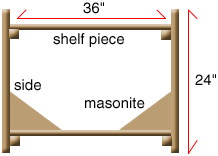 | 2. Sand all pieces smooth. 3. Mark the best sides of the wood for the sides that show. Then mark the most evenly cut edges as the bottom. 4. Measuring from the bottom and inside of the 2 foot pieces, mark a line at 4 and 19 inches on both pieces. 5. Glue and clamp the support 1 x 2s below the 4 and 19 inch lines. 6. Drill two holes for the screws in each board; put a little glue in each hole. |