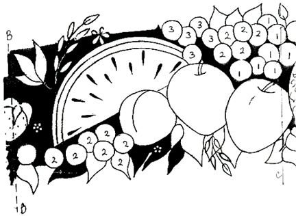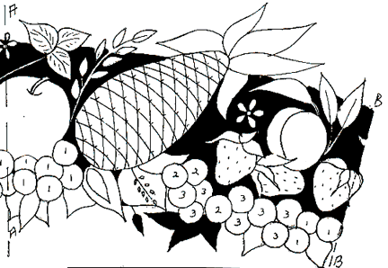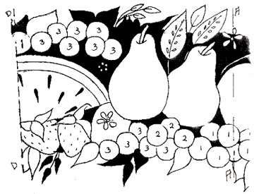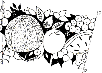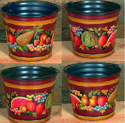 Preparation Wash bucket in soapy water, rinse in vinegar, let dry thoroughly. Prime with metal primer. Painting Instructions 1. Basecoat the bucket with Rookwood Red and paint a three-inch Lamp Black area (the area behind the fruit)) around the circumference of the bucket. Then paint the inside of the bucket with Lamp Black. The trim is Golden Straw. 2. Trace design on tracing paper and place over Black area of the design. It will be easier to transfer the design if you cut the tracing paper to fit the bucket. 3. Leaves: Lamp Black, Hauser Dark, Hauser Medium and Hauser Light Green. Some leaves are painted Golden Straw. Refer to photograph. 4. Watermelon: Basecoat Napthol Red + Titanium (Snow) White. Rind is Titanium White, Green rind is Mistletoe. Seeds are Lamp Black. Drybrush some Light Buttermilk on the upper red area. 5. Cantaloupe: Basecoat Viridian Green + a touch of Prussian Blue. Skin: Mix Titanium White + a touch of Yellow Ochre. Using a Liner Brush, sweep brush back and forth in a circular motion. 6. Pineapple: Basecoat Golden Straw. Highlight left side of pineapple with Light Buttermilk. Cross-hatching is Dark Chocolate. Leaves are Hauser Medium Green. Highlight with Golden Straw, shade with Cherry Red. 7. Peach: Basecoat with Golden Straw. Shade with Cherry Red. Highlight with Cadmium Yellow, then highlight again in Light Buttermilk. Sponge Titanium White in the middle area for last highlight. 8. Apples: Basecoat Cherry Red, shade with Deep Burgundy. #1 Highlight is Tangerine. #2 Highlight is Cadmium Yellow. #3 Highlight is Light Buttermilk. Final strong highlight is Titanium White. Stem is Dark Chocolate with Light Buttermilk highlight. 9. Pears: Basecoat Golden Straw and shade with Cherry Red. Second darker shading is Deep Burgundy. #1 Highlight is Bright Green. #2 Highlight is Cadmium Yellow. #3 Highlight is Light Buttermilk. Add a final strong Titanium White highlight. Stem is Dark Chocolate with Light Buttermilk highlight on the left side of stem. 10. Strawberries: Basecoat Cherry Red. Shade Deep Burgundy. #1 Highlight is Tangerine. #2 Highlight is Cadmium Yellow. #3 Highlight is Light Buttermilk. Strawberry leaves are Hauser Medium Green. Highlight with Golden Straw. Seeds are Lamp Black with a touch of Golden Straw on the left side. 11. Pink Grapes: Basecoat Boysenberry + a touch of Golden Straw + Titanium White. Shade with Cherry Red. Highlight Light Buttermilk. Final highlight is Titanium White. 12. Blue Grapes: Basecoat Country Blue + Titanium White. Shade with Blueberry, then shade again with Navy Blue. Highlight with Light Buttermilk. Final highlight is Titanium White. 13. Green Grapes: Basecoat Olive Green + Cadmium Yellow + Titanium White. Shade with Cherry Red. Highlight with Buttermilk. Final highlight is Titanium White. 14. Blossoms: Paint Light Buttermilk with Tangerine centers. NOTE: All highlights are on the left side and each highlight is smaller in size than the preceding one. Remember to use very little paint when you float on your highlights. |