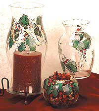 Ultra Gloss Acrylic Enamels provide a durable, high-gloss finish to almost any hard surface. Ultra Gloss is safe, easy-to-use and non-toxic. There are 36 colors and a clear medium to create soft tints and durable glazes. Transferring Pattern Lay tracing paper over pattern and draw the basic lines. Lay this tracing on the surface to be painted. Tape to secure. Slip graphite paper between the tracing and the surface. Trace with a pencil to transfer the design. Do not trace details until after basecoating has dried. Preparation Wash glass with vinegar and water. Rinse thoroughly with water and dry with soft cloth. Painting Instructions 1. Transfer leaf pattern to compressed sponge, then cut out shape. Wet sponge to expand; wring out. 2. On the palette, squeeze a small amount of Avocado next to an equal amount of Hunter. Press sponge in middle, getting both colors to cover the sponge surface. Stamp on glass surface randomly to create groupings of leaves. Let dry. 3. Cut a small circle out of the compressed sponge, and prepare the same way. Prepare with equal amounts of Burgundy and Buttermilk side by side, and dip end of sponge to cover with both colors. Sponge on the glass surface in and around the leaves to create berries. Let dry. 4. To add the bow detail, transfer pattern onto glass surface and paint in design with Buttermilk. Let dry, then highlight with Bright Gold Metallic. 5. Outline the bow, leaves and berries with Gloss Black. Let dry. Highlight black outlining with Bright Gold Metallic. 6. To finish piece, use liner and Bright Gold Metallic to paint small stripes spaced about 1/2" apart around rim of glass. |