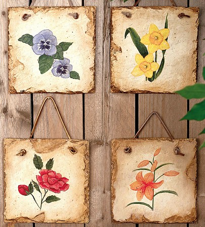 1. Basecoat tiles with Daisy Cream, using 1" flat brush. 2. Transfer each design to center of each slate. 3. Paint designs as follows: DAFFODIL 1. Paint leaves Fern Green and shade with Pine Green and highlight with Fiesta Yellow, using #2 liner and #4 flat brush. 2. Paint outer petals Fiesta Yellow with #4 flat brush. Outline with 1:1 mix of Fiesta Yellow and Tiger Lily Orange. 3. Triple load #4 brush with Fiesta Yellow on sides and Tiger Lily Orange in center. Pull from outside in to make daffodil center. 4. Float thinned Geranium Red on outer edge. Shade flower center with thinned Fern Green and pull two or three strokes of Cloud White from center. PANSY 1. Paint leaves Fern Green, shade with Pine Green and highlight with Fiesta Yellow with #2 liner and #4 flat brush. 2. Combine violet mix (1:3 mix of Geranium Red and Tango Blue) with equal part Cloud White to paint petals. Outline with thinned violet mix. 3. Shade flower center with Fern Green and Cloud White. Pull strokes of violet mix from center outwardly and highlight tips of each stroke with Cloud White. ROSE 1. Paint leaves Fern Green, shade with Pine Green and highlight with Fiesta Yellow with #2 liner and #4 flat brush. 2. Double load #4 flat brush with Geranium Red and Cloud White. Fill in with white on the outer edge of each petal. With 1:2 mix of Pine Green and Geranium Red, outline each petal. TIGER LILY 1. Paint leaves Fern Green, shade with Pine Green and highlight with Fiesta Yellow with #2 liner and #4 flat brush. 2. Fill in petals with 1:1 mix of Tiger Lily Orange and Cloud White. Float Fiesta Yellow for highlight. 3. Mix 1:1 mix of Tiger Lily Orange and Geranium Red and pull strokes with #2 liner from center outward. (Refer to photo.) Dot petals lightly with same color. 4. From the center, add three or four strokes of Cloud White with dots of Woodland Brown at end. FINISHING INSTRUCTIONS 1. Antique each tile with Woodland Brown and wipe back with moist towel. Let dry. 2. Antique again with Golden Honey and wipe back. Repeat as many times as necessary to achieve desired effect. 3. Thin Woodland Brown with water and lightly spatter over entire surface with toothbrush. |