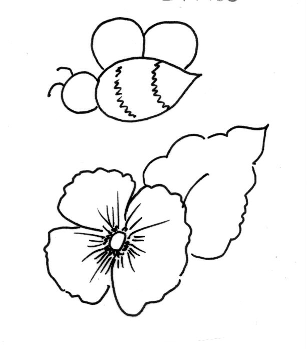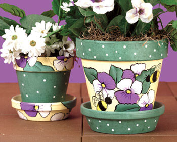 Patio Paint is a self-sealing exterior paint. No prior preparation is needed when working on wood. For other surfaces, follow directions on label. Patio Paint may be used on all porous surfaces such as concrete, terra cotta, wood, plaster, etc. Because of the self-sealing agents, the paint does not require a varnish upon completion. Transferring a Pattern Lay tracing paper over pattern and draw the basic lines. Lay this tracing on the surface to be painted. Slip graphite paper between the tracing and the surface. Tape to secure. Trace with a pencil to transfer the design. Do not trace details until after basecoating has dried. Instructions 1. Pour puddle of Chive Green and Sprout Green in plate. Dip synthetic sponge in both greens. Pounce a few times to blend. Sponge 6" saucer, 6" pot rim and 4" pot base. Let dry. 2. Use #12 brush to paint 6" pot base, 4" pot rim and 4" saucer with Buttercup Yellow. Let dry. 3. Transfer pansy, leaf and bee patterns as desired on yellow areas. 4. Use #8 flat brush to paint pansies with Petunia Purple and Cloud White; leaves Chive Green with Sprout Green shading; bees Fiesta Yellow and Wrought Iron Black, and pansy centers Fiesta Yellow. 5. Use liner to outline flowers, leaves and bees with Wrought Iron Black. 6. Use liner to pull Pansy Purple lines from flower center onto petals. 7. Use handle tip of #8 brush to dot Cloud White randomly on green areas. |