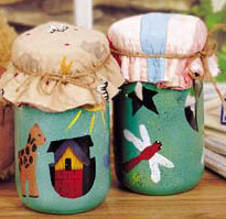 Lay tracing paper over pattern and draw the basic lines. Lay this tracing on the surface to be painted. Slip graphite paper between the tracing and the surface and secure. Trace with a pencil or stylus to transfer the design. Do not trace details until after basecoating has dried. Preparation Clean jars with 1:1 mix of vinegar and water; dry. Painting Instructions Noah’s Ark Jar 1. Trace ark shape onto back of Easy Cling stencil. Cut out with scissors, peel off backing and place on jar. 2. Sponge one to two coats of Sage Green onto jar with petitfour sponge, letting dry between coats. 3. Trace giraffe and elephant patterns onto compressed sponge. Cut out, dip in water to expand, squeeze out excess water. 4. Pounce sun on jar with Cadmium Yellow. Use liner brush to make rays. 5. Dip giraffe sponge into Sable Brown and place on jar, gently pressing with fingers and carefully lifting off. Repeat to make two giraffes. Add spots and nose with Chocolate and eyes with Gloss Black. 6. Use Williamsburg Blue to make two elephants. Add Gloss Black details. 7. Spatter with Gloss White, using old toothbrush. 8. Transfer ark pattern to birdhouse. Paint roof with Americana Williamsburg Blue, middle section Golden Straw, bottom Santa Red. Shade Golden Straw with Burnt Umber. Basecoat door and add details with Gloss Black. Dragonfly Jar 1. Trace moon and star patterns on back of Easy Cling stencil, repeating star pattern to make 3 stars. Cut out, peel off paper backing, and place on jar. 2. Sponge one to two coats of Sage Green onto jar with petitfour sponge, letting dry between coats. 3. Reproduce dragonfly pattern to make 3 and transfer to jar; pounce body with Christmas Red and wings with Gloss White. Dot eyes with Gloss Black. 4. When dry, highlight eyes with Gloss White. 5. Spatter with Cadmium Yellow and then Gloss Black, using old toothbrush. Finishing Instructions 1. Score around stencils with X-acto knife; lift off. Clean paint smears or messed edges with X-acto knife. 2. Glue birdhouse to bottom of Noah’s Ark jar. 3. Drill 1" hole into each jar seal and attach clip-in light with bulb. 4. Cut 8" circle from fabric for each jar. Sew in elastic with zig-zag stitch 1" from edge. Pull elastic to gather. Stitch to secure ends. 5. Place jar seal into ring, screw onto jar and place cloth bonnet on. Tie jute around bonnet. Note: Do not leave jar lights unattended while turned on. |