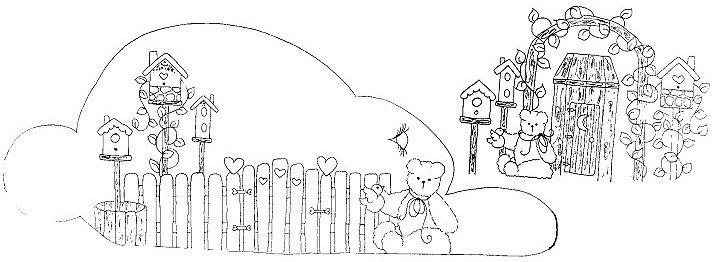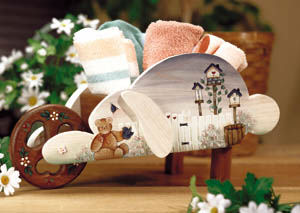 | PREPARATION 1. Sand, tack and seal with Multi-Purpose Sealer bunny and ears only on wheelbarrow, and sides and knob of tissue holder. 2. On wheelbarrow, apply a wash of Buttermilk to bunny; stipple ears with Light Buttermilk. On tissue holder, apply a wash of Light Buttermilk to areas sealed. 3. On wheelbarrow, side load 3/4" brush with Uniform Blue. Starting at top of bunny, float Uniform Blue down toward fence. 4. Side load 3/4" brush with Arbor Green. Starting at bottom of bunny, float Arbor Green up toward sky. 5. Sand, tack and apply Gel Stain to wheel, legs, bottom and two end pieces of wheelbarrow, and top of tissue holder. 6. Transfer patterns to each piece. PAINTING INSTRUCTIONS Note: After completing each section, do line work as needed. All line work is done with #0 liner and Lamp Black, unless specified otherwise. Wheelbarrow Birdhouses 1. Basecoat posts, platforms and barrel with a wash of Sable Brown. Shade with Asphaltum. Do liner work and wood grain with Lamp Black. 2. Paint all chimneys Lamp Black. 3. Basecoat white sections of houses with wash of Light Buttermilk; shade Sable Brown. 4. Heart on the middle house is Brandy Wine. 5. Shade openings on the two side houses with Uniform Blue. 6. The flower centers on the two side houses are a dot of Honey Brown. The petals are dots of Light Buttermilk. The leaves are Arbor Green. 7. Basecoat roofs with Uniform Blue; shade Deep Midnight Blue; highlight French Grey Blue. Outline scalloped trim on roof on middle house with Brandy Wine. Dots are Light Buttermilk. 8. Perches are dots of Sable Brown. 9. Basecoat stone section of middle house with wash of black. Basecoat stones with wash of Slate Grey; shade black; highlight Light Buttermilk. Vines and Leaves With liner, apply vine with Arbor Green. Paint leaves with wash of Arbor Green; shade Antique Teal. Fence 1. Basecoat fence with Light Buttermilk; shade with Toffee. 2. Basecoat hinges and latch with black; highlight and add dots of French Grey Blue for nails. 3. Paint hearts with Brandy Wine. Dots are Light Buttermilk. Bunny’s Eye 1. Basecoat white section with Light Buttermilk; shade Sable Brown. 2. Float cheek with Brandy Wine. Dot is Light Buttermilk. 3. Basecoat iris with Uniform Blue; shade Deep Midnight Blue; highlight French Grey Blue. Line eye and eyelashes with black. Add a dot of Light Buttermilk to the iris. Bear 1. Basecoat with a wash of Sable Brown; shade Milk Chocolate; stipple highlights with Toffee. 2. Float cheeks and inside ears with Brandy Wine. Add Light Buttermilk dot to each cheek. 3. Eyes and nose are dots of black. Add black line below nose and Light Buttermilk dot to each eye. 4. Use liner to add ribbon and dot for knot with Brandy Wine. Bird 1. Basecoat with Uniform Blue; shade Deep Midnight Blue; highlight French Grey Blue. 2. Add line work and eye with black. Add Light Buttermilk dot in eye. 3. Paint the beak with Honey Brown. Bushes 1. Stipple with Arbor Green and again with Antique Teal. 2. Stipple flowers with Brandy Wine. While paint is still wet, stipple again with Light Buttermilk; add random dots of Light Buttermilk. Wheel 1. Refer to birdhouse instructions for painting flowers and hearts and vine instructions for leaves. 2. Add random dots of Brandy Wine and French Grey Blue. Toilet Tissue Cover Birdhouses 1. Basecoat posts, platforms, archway and outhouse with a pale wash of Asphaltum; shade with Asphaltum. Add liner work and wood grain with black. 2. Paint moon, hinges, doorknob and chimneys black. 3. Shade white sections of houses with Camel. 4. Basecoat heart on house on right with wash of Gooseberry Pink; shade with Rookwood Red. 5. Shade openings on two houses on left with Asphaltum. 6. Basecoat roof with pale wash of Uniform Blue; shade Uniform Blue. 7. Perches are dots of Milk Chocolate. 8. Basecoat stone section and stones on house on right with wash of Slate Grey. Shade stones black; highlight Light Buttermilk. Vine and Leaves 1. Use liner to paint vine black. 2. Basecoat leaves with pale wash of Arbor Green; shade Antique Teal. 3. Add random dots of Rookwood Red and Light Buttermilk throughout vine. Bear 1. Basecoat with a pale wash of Milk Chocolate; shade Milk Chocolate. 2. Float cheeks with Rookwood Red; add Light Buttermilk dot to each cheek. 3. Eyes and nose are dots of black with Light Buttermilk dots. 4. Use liner to add ribbon and dot for knot with Rookwood Red. Bird 1. Basecoat with a pale wash of Uniform Blue; shade Uniform Blue. 2. Eye is dot of black with Light Buttermilk dot. Beak is Camel. Bushes 1. Follow wheelbarrow instructions for bushes, substituting Rookwood Red for Brandy Wine. 2. Add random dots of Light Buttermilk. FINISHING INSTRUCTIONS Apply Satin Varnish to both pieces. |
