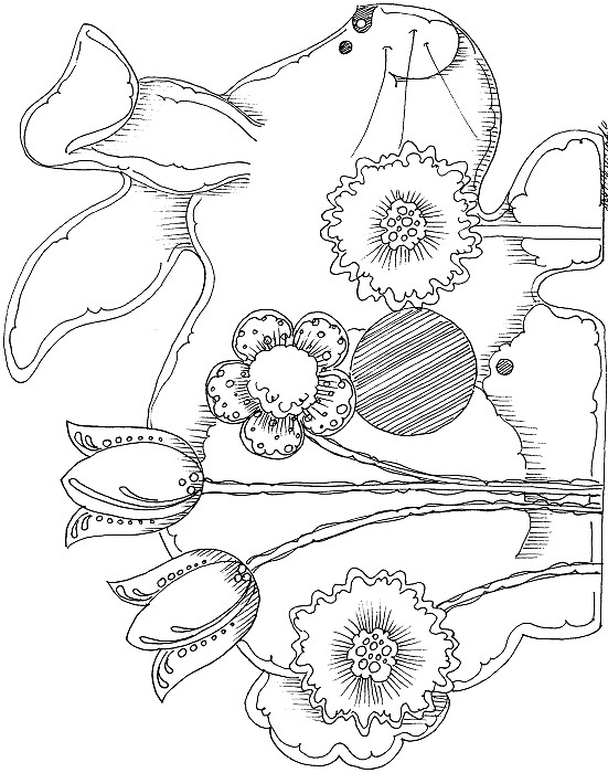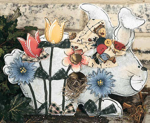 detailing are done, sand again before assembling.) 2. Stain bunny with Heavenly Grey Heavenly Hues. Float shadows with a mix of 1 part heavenly Grey to 1 part Lamp Black. Stipple highlights with Titanium White. 3. Chalk the cheeks and insides of ears. Do liner-work and facial features with Black. Flowers Transfer pattern as needed for details. 1. Blue flowers: Paint with a mix of 2 parts White to 1 part Uniform Blue. Float shadow from centers out with Uniform Blue. Float highlights with White. Centers are dots of True Ochre. 2. Pink Flowers: Paint in a mix of 1 part White to 2 parts Gooseberry Pink. Float shadows Gooseberry Pink plus a touch of Country Red. Float highlights with White. Stipple centers with Dark Chocolate and True Ochre. 3. Tulips: Paint red ones in 2 parts Country Red to 1 part Gooseberry Pink. Float shadows with Country Red. Do tole strokes and dots in White. 4. Paint yellow tulips in 2 parts White to 1 part True Ochre. Float shadows with True Ochre. Do tole strokes and dots in White. 5. Stems: Paint Forest Green. 6. Do liner-work in Black. Finishing Instructions Spray with Matte Spray Sealer. Assemble according to photo, gluing on fabric bows, buttons, etc |