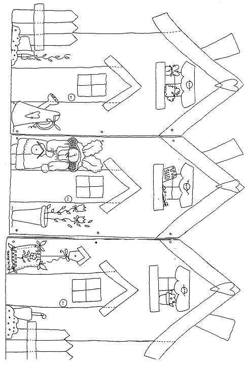 join the others (see photo). Painting Instructions Use #12 flat brush unless otherwise specified. Basecoat all three chimneys Rookwood Red and fences and fence pieces Bittersweet Chocolate. House #1: Basecoat with Silver Sage Green. Window awning and door: Russet. Roof, window sill and door roof: Deep Midnight Blue. House #2: Basecoat with Dried Basil Green. Roof, window sill and door roof: Sable Brown. Window awning and door: Evergreen. House #3: Basecoat Cashmere Beige. Door and window awning: Black Plum. Roof, window sill and door roof: Royal Purple. Sanding Instructions 1. Sand edges of all houses, chimneys, sills and window awnings, door roofs and fences. Sand heavily on areas where you want extra worn look. Wipe clean with tack cloth. 2. With damp rag, rub just enough Burnt Umber to get the antique look you like. Let dry. 3. Wire houses together. Bring wire from front of houses to back; twist wire together to secure. 4. Transfer pattern for details. Painting Instructions House #1: 1. Basecoat windows Desert Sand. Shade with Raw Sienna and line panes with Burnt Umber. Line around windows with black. 2. With #6 flat brush, basecoat bunny Camel. Shade with Raw Sienna. Dry-brush cheeks with Rookwood Red. Line bunny with Burnt Umber. 3. With #6 flat brush, basecoat soil Sable Brown; dot with Desert Sand. 4. With #6 flat brush, basecoat pot Burnt Orange; shade with Rookwood Red. 5. Line vine with Burnt Umber; leaves Evergreen with liner. 6. Watering can is Graphite, heart is Rookwood Red, lined with Desert Sand. Line door, fence and watering can with Lamp Black. House #2: 1. Paint windows same as House #1. 2. Basecoat seed packet French Vanilla. Shade with Raw Sienna. Basecoat checks Sapphire. Line word “seed” and packet with Lamp Black. 3. Basecoat bunny’s ears, face, hands and feet with Camel. Shade with Raw Sienna. Dry blush cheeks with Rookwood Red. Line with Burnt Umber. Basecoat bunny’s blouse French Vanilla and shade with Raw Sienna. Dot buttons black. Paint overalls Deep Midnight Blue, lined with Desert Sand. Paint birdhouse Golden Straw, dry-brushed with French Vanilla. Line roof with Dried Basil Green. Dot hole black. Cuffs on overalls are Black Plum. Basecoat Bunny’s hat Sable Brown. Band around brim of hat is Burnt Umber. Line crosshatching area under brim with Burnt Umber. 4. Basecoat clay pot Burnt Orange and shade with Rookwood Red. Line vines with Burnt Umber. Leaves are Evergreen. Tulips are Sapphire and Golden Straw. Line pot and bows under tulips with black. House #3: 1. Paint windows same as for House #1. 2. Basecoat clay pot in window with Rookwood Red. Basecoat flower with Golden Straw and leaves with Evergreen. Dot flower center with Bittersweet Chocolate. Line with black. 3. Basecoat bag of soil French Vanilla. Shade with Burnt Umber. Basecoat flower with Golden Straw. Dot center with Bittersweet Chocolate. Line stem with Burnt Umber and basecoat leaves with Evergreen. Basecoat checks with Sapphire. Line bag, stitching and bows tied to corners of bag with Bittersweet Chocolate. Birdhouse is Deep Midnight Blue with Rookwood Red roof. Dot hole black. Pole and bow are lined with Bittersweet Chocolate. 4. Basecoat soil Sable Brown. Dot with Desert Sand. Spade is Graphite with Rookwood Red handle. Line spade, soil and fence with black. Finishing Instructions 1. Dry-brush all areas you want to highlight with French Vanilla. Let dry. Use spatter brush or old toothbrush to lightly spatter with Bittersweet Chocolate. 2. Tie floss through 3 small buttons; glue to window awnings. Cut 3 small pieces of fabric and make ties. Glue to tops of door windows. 3. Glue 3 small buttons to doors (for knobs). 4. Cut 3 hearts from rusted tin and glue and nail to roofs. 5. Glue a small heart grapevine wreath to window of House #1. Glue grapevine twig to window sill of House #2. Tie twine bow to round wreath and glue to door roof. 6. Spray houses with matte sealer. Helpful Hint: You can enlarge this small screen to make a window screen or even larger for a fireplace screen. |