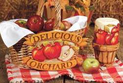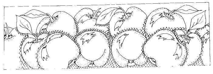 | PREPARATION Clean candle with rubbing alcohol and dry. PAINTING INSTRUCTIONS Terra Cotta Pots 1. Paint the pots with Daisy Cream, making sure to paint the entire pots, inside and out, including the drain hole. Let dry. 2. Measure 1" from the bottom and mask off bottom of each pot with tape. 3. Mix equal parts Pinecone Brown and Clear Coat. Use 3/4" brush to pull vertical strokes over the side of the pot with the mix. Remove tape and pull horizontal strokes around exposed area and rim. 4. Use liner brush filled with Old Brick Red to freehand vertical 1" wide lines to separate slats on crate. The ends of the top and bottom bands are a curved Old Brick Red line. 5. Create the grain in the wood with Old Brick Red, using the liner. Add an occasional Woodland Brown knothole. 6. Shade to the right of each slat and behind the bands with Woodland Brown. Use tacky glue to glue sheet moss inside the top edge of small pot. Candle Note: Mix all paints 1:1 with Candle Painting Medium. 1. Use dampened sponge to pounce opaque coverage of Daisy Cream over entire candle. Let dry. 2. Transfer pattern around candle with exception of the highlighted areas on the apples. These need to be freehanded, as the marks will show through the paint. 3. Use the liner to pull out Fiesta Yellow inside the indentations at the stem and calyx. 4. Use the filbert to basecoat the apple with Geranium Red. Two coats may be needed. Allow the color to fade into the highlighted area and the indentations. Leave the highlighted area free of color. Let dry. 5. Shade areas shown on pattern by dots with Old Brick Red. Use the filbert brush to stroke Fiesta Yellow over the highlight and across the highest parts of the apple. Allow the color to fade into the red. Add several strokes of Cloud White over the highlight for an added shine. Shade as shown on the pattern by the crosshatch marks with Woodland Brown. 6. Outline the apples with Woodland Brown. 7. The stems are Pinecone Brown. Shade the left side with Woodland Brown; highlight the right side with Daisy Cream. 8. Basecoat the leaves with Citrus Green. Shade the lower edges with Old Brick Red and highlight the top edges with Fiesta Yellow. Outline and add the veins with Old Brick Red. Basket 1. Use the dampened sea sponge to pounce Daisy Cream over the plaque. While still wet, pounce in Pinecone Brown to achieve a mottled effect. 2. Paint the banners Fiesta Yellow. Let dry. 3. Mix equal parts Pinecone Brown and Clear Coat. Apply across banners with 3/4" wash brush to antique. Let dry. 4. Transfer the pattern. Shade as shown by dots on the pattern with Old Brick Red. Highlight the top edges with Fiesta Yellow, using #12 flat brush. The letters are painted with #4 flat brush and outlined with Woodland Brown, using liner. 5. Paint the apple cut-outs Daisy Cream. Let dry and transfer the patterns. Refer to the candle instructions to paint the full apples, stems and leaves, omitting the Candle Painting Medium. 6. Paint the skin around the half apple Geranium Red. Shade inside the skin with Pinecone Brown. Float Citrus Green around the core. Float Old Brick Red hit-and- miss lightly around the core. The seeds are Old Brick Red outlined with Woodland Brown. 7. Drill two small holes at the top and bottom of the plaque and secure it to the basket with jute or glue the plaque to the side of the basket. Hot glue the banners to the top and bottom of the plaque and apples in the center as desired. |