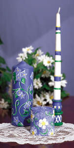| PREPARATION Clean candles with rubbing alcohol and dry. PAINTING INSTRUCTIONS Note: When painting candles, mix all paint colors 1:1 with Candle Painting Medium. 1. Basecoat 8" pillar with Sapphire and taper with Titanium White. Sponge Titanium White onto 3" pillar, then sponge with Sapphire. 2. Basecoat candle cup and spool with Sapphire. 8" Pillar 1. Transfer pattern. Paint vines and leaves with Mistletoe, using liner. Fill leaves with #6 flat brush. 2. Paint Morning Glories with #6 flat brush and 1:1 mix of Sapphire and Titanium White. Dip dot centers with Cadmium Yellow. 3. Highlight left sides of flowers with Titanium White; shade right side with Payne’s Grey. 3" Pillar 1. Use pouncer to make five-petal flowers and centers with Titanium White. Pounce over white centers with Cadmium Yellow. 2. Use liner to make swirls of Mistletoe and Titanium White between flowers. Taper Using #6 flat brush, paint Sapphire stripes. Using #1 liner, make Cadmium Yellow and Mistletoe stripes, referring to photo for placement. Spool 1. Paint diamond pattern on spool with Titanium White and liner. 2. Use liner to paint trim Mistletoe. Candle Cup 1. Paint simple flowers, using liner with Titanium White and Cadmium Yellow. 2. Use liner to paint Mistletoe swags below flowers and trim edge along top. 3. With 1:1 mix of Mistletoe and Titanium White, paint short lines over green trim and at lowest point of swags. FINISHING INSTRUCTIONS 1. Glue cup and spool together with wood glue. 2. Use #6 flat brush to apply two coats of DuraClear to picket and candle holder. |