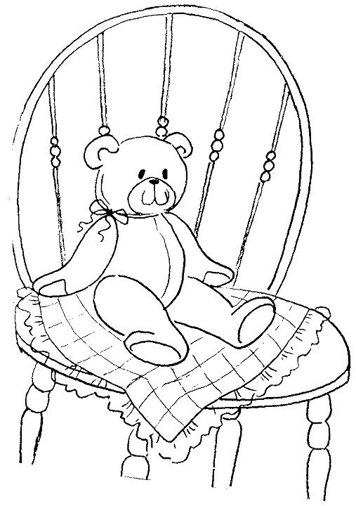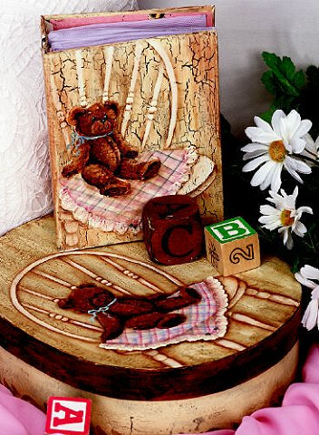 | PREPARATION 1. Basecoat box and album with Asphaltum. Let dry. 2. Apply Weathered Wood. Let dry. 3. Apply one thick coat of Sand, being sure not to overstroke. (Overstroking will cause holes. If this happens, patch when dry.) 4. For box, basecoat sides of lid and add comma strokes to sides of box bottom with Asphaltum plus Milk Chocolate. 5. Transfer pattern for chair and quilt. PAINTING INSTRUCTIONS 1. Basecoat chair and quilt Lt. Buttermilk, shade Milk Chocolate and deepen spots with Asphaltum. Use end of brush to make dots on chairs. Add highlights on back with Lt. Buttermilk, if necessary. 2. Side load plaid on quilt with Baby Blue, then Boysenberry Pink. 3. Apply pattern for bear and ruffle. 4. With Decorating Paste and angle tip, add paste to one part of bear at a time. Stipple with filbert to add texture. (See photo below.) 5. Add raised ruffle with Decorating Paste and tip; use filbert to smooth it down to quilt, but keep it off the quilt. (Use blow dryer to speed drying time.) 6. Basecoat ruffle Lt. Buttermilk; shade with Boysenberry Pink plus Asphaltum. 7. Paint rose Boysenberry Pink plus Lt. Buttermilk; shade with Boysenberry Pink. Add side loaded Lt. Buttermilk petals. 8. Leaves are Midnite Green plus Lt. Buttermilk; shade with Lt. Buttermilk. 9. Bear is basecoated with a wash of Milk Chocolate. Shade with Asphaltum and deepen shade here and there with a little Asphaltum plus Lamp Black. Eyes, nose and mouth are Lamp Black with Lt. Buttermilk stroke. Cheeks are float of Boysenberry Pink. Bow is Baby Blue with Lt. Buttermilk highlights. FINISHING INSTRUCTIONS 1. Varnish both pieces with Satin Varnish using large flat brush. Let dry. 2. Apply wash of Asphaltum and wipe off before it dries. Add 2 more coats of varnish. 3. Add 2 pieces of decorative paper to inside of photo album, if desired. |