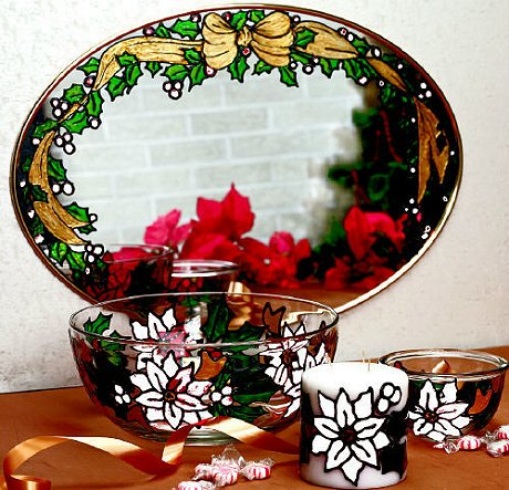 | PREPARATION Clean candle with alcohol and paper towels. Clean glass with warm soapy water and 1:1 vinegar/water rinse. PAINTING INSTRUCTIONS Note: It’s important to work on a flat surface to avoid drips. 1. Remove protective coating from Styrene Painting Blank and place patterns under blanks, dividing mirror pattern into segments. (Make enough duplicates of candle and bowl patterns to circle surfaces.) 2. Apply leading paint over pattern outlines. Let leading dry 1 to 2 hours. Bowls & Candle Holding bottle tip slightly above surface and moving side to side, fill with paint as follows: Poinsettias: petals Primary Red, centers Primary Yellow, center petals Primary Red, outer petals Christmas Red. Holly Leaves: one side Lemon Lime, other side Leaf Green. Holly Berries: Christmas Red. Ribbon: Gold Pearl Mirror 1. Holding bottle tip slightly above surface and moving side to side, fill with paint as follows: Ribbon: Partially fill with Root Beer Brown. While wet, squeeze dots of Gold Pearl on Root Beer Brown. Use toothpick or tip of bottle to pull Gold Pearl through Root Beer Brown. Holly and Berries: Use the same colors as for bowls and candle. 2. Let dry 24 hours or until clear. 3. Gently peel designs and press onto clean glass surface. |