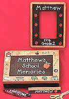 Americana acrylics are artist-quality, water-based, non-toxic paints. They are intermixable and suitable for almost any surface. They are creamy to facilitate smooth and easy brush strokes, and highly pigmented for richer color and one-stroke coverage. The wide range of colors makes color coordination easy - it reduces the waste of mixing to get the perfect hue. Transferring Pattern Lay tracing paper over pattern and draw the basic lines. Lay this tracing on the surface to be painted. tape to secure. Place graphite paper between the tracing and the surface. Trace with a pencil to transfer the design. Do not trace details until after basecoating has dried. Preparation: Sand wood if needed, and wipe with a tack cloth. Painting Instructions for Box 1. Mask off a 1-1/8" border on box lid. Use #12 flat brush and Lamp Black to paint entire box - including inside square on lid. After paint is dry, remove masking tape. 2. Use the #12 flat to apply Oak Gel Stain to remaining raw wood area. Wipe immediately with paper towel, and allow to dry. 3. Trace and transfer pattern to box lid. 4. Use #6 flat and True Red to paint schoolhouse, right side of ball, the letter 'B', and the apple. Use Cadmium Yellow for school bus, center of ball, and pencils. The house and sign are painted Titanium White; house roof, tree tops, the letter 'C', and apple leaves are Kelly Green; cat is Lamp Black. The letter 'A', the word 'cat' and left side of ball are True Blue. Let dry. 5. Use liner brush and Titanium White to paint child's name and "School Memories". Use back handle tip of brush to dot letters and apples with True Red. 6. Use liner to paint Lamp Black details and for outlining around designs in lid's margin (refer to photo). Let dry. Instructions for Frame: 1. Mask off 3/8" border. Use #12 flat to apply Oak Gel Stain- wipe back with paper towel. After removing masking tape, paint remaining areas with Lamp Black. 2. Trace and transfer pattern. 3. Using #6 flat, paint apples True Red and leaves Kelly Green. Let dry. 4. Use liner brush and Titanium White to paint highlights on apples, child's name, date, and grade. Let dry. Instructions for Ruler: 1. Mask off number area of ruler. Use #12 flat to paint exposed area with lamp Black. After removing tape, apply Oak Gel Stain to number area. 2. Using #6 flat, paint apples True Red and leaves Kelly Green. 3. Use liner brush to paint child's name and apple's highlights with Titanium White. Let dry. Finishing Instructions: All pieces may be sprsyed with 2 light coats of Matte Spray. Allow to dry between coats. Optional: For shiny finish, use Gloss Spray. |