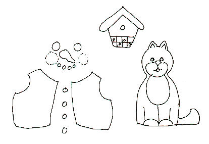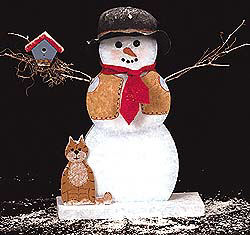 Patio Paint is a self-sealing exterior paint. No prior preparation is needed when working on wood. For other surfaces, follow directions on label. Patio Paints may be used on all porous surfaces such as concrete, terra cotta, wood, plaster, etc. Because of the self-sealing agents, they do not require a varnish upon completion. Transferring Patterns Lay tracing paper over pattern and draw the basic lines. Lay this tracing on the surface to be painted. Slip graphite paper between the tracing and the surface. Tape to secure. Trace with a pencil to transfer the design. Do not trace details until after basecoating has dried. Painting Instructions 1. Use #10 flat shader brush to basecoat entire snowman shape with Cloud White. Let dry, then transfer the pattern onto the shape. 2. Use deerfoot brush to stipple Light Waterfall Blue all along the edges and around the vest. (To Stipple: Load old fluffy brush in color. Wipe off excess on paper towel. Use up-and-down patting motion on the surface.) 3. Stipple Golden Honey on vest and cat shape. 4. Use #4 flat brush to paint birdhouse with Light Waterfall Blue roof with Geranium Red, and checks with Golden Honey. 5. Use detail brush to paint Geranium Red wiggle lines all along vest edges, then use back end of brush to place small dots on Light Waterfall Blue X's and on vest. The birdhouse also has small dots on every other Golden Honey check. 6. Use #4 brush to fill the nose with Golden Honey, then use Geranium Red to shade top side of nose. Use deerfoot brush to add blush to cheeks with Geranium Red. 7. Use detail brush to paint Wrought Iron Black details on faces and buttons. Use black marker for fine line details on cat body. 8. Use deerfoot to stipple Cloud White on cat body. 9. Use glue to adhere all pieces together. Refer to photo for placement. |