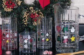 | Preparation Wash glassware in lukewarm soapy water. Rinse well. Rinse again in a mixture of 1 part vinegar + two parts water. Dry with lint-free cloth. Cut pattern. Tape pattern inside glassware to show through glass. Center designs as necessary. Painting Instructions 1. Basecoat designs onto glassware with Gloss White, using a #3 or #1 Round Brush. Pick up small amounts of paint and apply thin layers of smooth, even strokes. Allow to dry for one hour. (If you try to paint over wet Ultra Gloss, the basecoat will lift up.) 2. Apply Cranberry to Santa’s hat, heart, sock and candy cane stripes. Apply Hunter Green to tree and holly, Cadmium Yellow to star; Sable Brown to gingerbread man and tree base; Flesh to Santa and Black to snowman’s hat. Apply a second coat of Gloss White to white areas. Allow to dry one hour and then re-apply all colors as desired. 3. When dry, detail designs as follows: Santa’s Face: Mix a little Cranberry + Gloss White for cheeks, using a Liner Brush. Dip toothpick in Gloss Black; dot on eyes. heart: Crosshatch with Gloss Black and Cadmium Yellow, using Liner Brush. Holly: Use Liner Brush and Gloss Black for leaf vein. Use paintbrush handle dipped in Cranberry to dot on berries. Snowman: Dip toothpick in Gloss Black and use to dot on eyes, mouth and buttons. Tree: Dip paintbrush handle in Cranberry and dot on ornaments. Use Liner to make star tree topper with Cadmium Yellow. Stocking: Use Liner to stripe stocking with Gloss White. Star: Use Liner to make “stitches” with Gloss Black. Gingerbread Man: Paint vest in Hunter Green with Round Brush. Dip toothpick in Gloss White; dot on eyes. Use Liner Brush to paint “frosting” mouth and wavy lines on arms and legs with Gloss White. Allow to dry. outline designs with Gloss Black, using a Long Liner. |