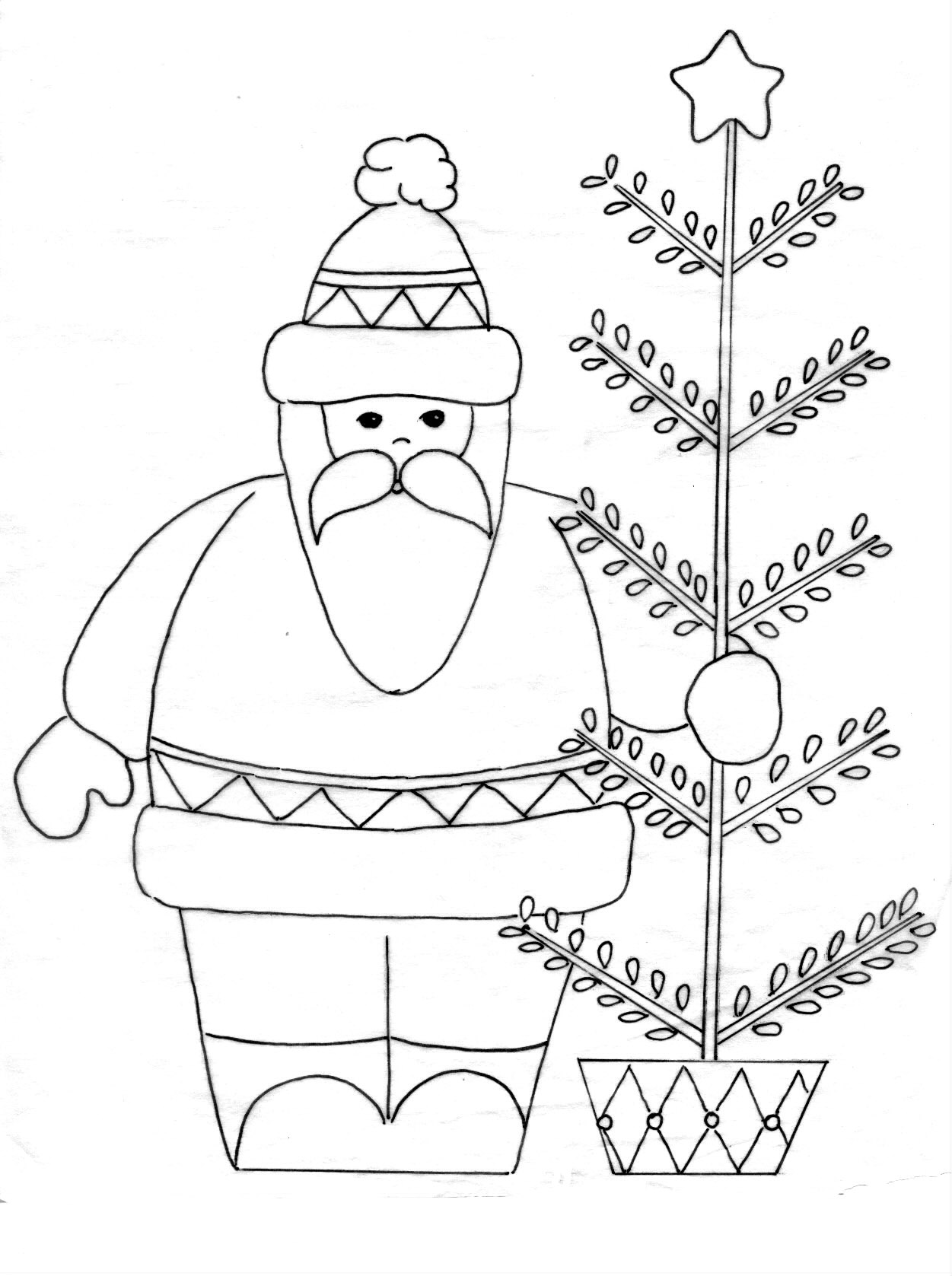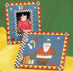 Americana Acrylics are artist-quality, water-based, non-toxic paints. They are intermixable and suitable for almost any surface. They are creamy to facilitate smooth and easy brush strokes, and highly pigmented for richer color and one-stroke coverage. The wide range of colors makes color coordination easy: It reduces the waste of mixing to get the perfect hue. Instructions 1. Measure off 1" outside border around three sides of memory album and 3/4" outside border around frame. Mark 5/8" border on inside of frame. 2. Use #12 flat brush to paint outside borders on book and frame Cadmium Yellow, left margin of book, inside border of frame and corner squares Light Buttermilk. Paint inside areas of book and frame Victorian Blue. 3. Transfer patterns* to book and frame. Draw 1-1/4" triangles on borders. Helpful Hint: Draw triangle on index card, cut out and use for a pattern. 4. Paint as follows: Dark Chocolate: Sack and tree branches; Santa Red: Coat, pant stripes, mouth, bottom triangles on coat and hat, outside triangles on book and frame borders, diamonds on tree buckets, stripes on gift box and number 9; Holly Green: Mittens, stripes on gift box, cap, tree needles, outside and inside edges of frame, pant stripes, gift ribbon and number 9; Cadmium Yellow: Top triangles on book and frame borders, tree stars and number 9; Lamp Black: Boots, diamonds on tree buckets, checkers on border squares, left margin of book and inside border of frame; Light Buttermilk: Beard, fur trim, remaining gift box, bow on striped box and number 1. 5. Use #10 flat brush to paint face with Flesh Tone. Mix small amount of Santa Red with Flesh Tone for cheeks and nose. 6. Use liner brush to paint eyes Lamp Black and outline all. 7. Use brush handle tip to dot Santa Red on Light Buttermilk package, Cadmium Yellow on tree bucket and Holly Green on Light Buttermilk corner checkers. Let dry. 8. Spray book and frame with two coats Americana Matte Spray, allowing to dry between coats. Designer: Donna Bush Techniques * Transferring a Pattern Lay tracing paper over pattern and draw the basic lines. Lay this tracing on the surface to be painted. Slip graphite paper between the tracing and the surface. Tape to secure. Trace with a pencil to transfer the design. Do not trace details until after basecoating has dried. |