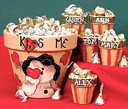 Patio Paint is a versatile, durable, product designed for outdoor decorating. No sealing or varnishing is required - its waterproof. Perfect for any hard surface, such as wood, plaster, concrete, terra cotta, and more. Patio Paint is non-toxic and easy to use. Transferring Patterns Lay tracing paper over pattern and draw the basic lines. Lay this tracing on the surface to be painted. Slip graphite paper between the tracing and the surface. Tape to secure. Trace with a pencil to transfer the design. Do not trace details until after basecoating has dried. Techniques * Stipple: Load old fluffy brush in color. Wipe off excess on paper towel. Use up-and-down patting motion on surface. * Float: Load brush in water or floating medium. Pat excess on paper towel. Dip one corner of brush in color. Blend color through brush on palette. Color should go from heavy on the loaded side to nothing on the opposite corner, graduating through bristles. * Spatter: Thin to consistency of heavy cream. Dip an old toothbrush in color. Drag thumbnail through bristles. Painting Instructions For 6" Pot 1. With 1" wash brush, basecoat entire pot in Antique Mum. 2. Transfer pattern to pot. 3. With old brush, stipple* snowman in White Cloud. Float* shadows with #8 shader in White Cloud plus a touch of Wrought Iron Black. Float cheeks with Red Pepper. 4. Basecoat hearts with #8 shader in Red Pepper. 5. Do all curved strokes with #1 liner in Citrus Green. 6. Basecoat hat. Do facial features and all liner work in black. 7. Spatter* with White. For 2" Pots 1. With 1" wash brush, basecoat in Antique Mum. 2. Basecoat stripes with #1 liner in Red Pepper. Do narrow stripes in Citrus Green. 3. Stipple rim in Sprout Green tipped in Citrus Green and then Sunshine Yellow. Dot with Red Pepper. 4. Do all liner work in black. 5. Add names of your choice to rims, using same style lettering as for 6" pot. 6. Spatter with White. |