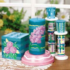 Americana Acrylics are artist-quality, water-based, non-toxic paints. They are intermixable and suitable for almost any surface. They are creamy to facilitate smooth and easy brush strokes, and highly pigmented for richer color and one-stroke coverage. The wide range of colors makes color coordination easy: It reduces the waste of mixing to get the perfect hue. Transferring Patterns Lay tracing paper over pattern and draw the basic lines. Lay this tracing on the surface to be painted. Slip graphite paper between the tracing and the surface and secure. Trace with a pencil to transfer the design. Do not trace details until after basecoating has dried. Preparation Clean all candles with rubbing alcohol and dry. Painting Instructions Note: When painting candles, mix all paint colors 1:1 with Candle Painting Medium. Basecoat all candles and spools with Desert Turquoise; add stripes with 1:1 mix of Titanium White and Desert Turquoise, referring to photo. Votives Make Titanium White dots and swirls and Pineapple stripes as shown in photo. Square Candle 1. Paint large flowers Orchid, small flowers Pineapple and leaves Bright Green. 2. Outline all with Titanium White. Pillar Candle 1. Paint flower Orchid and leaves Bright Green; highlight left side with Titanium White. 2. Add wavy Pineapple lines as shown in photo. Spools 1. Make stripes of Pineapple, Orchid, Bright Green and White to create plaid. 2. Paint circles Titanium White. Terra Cotta Tray Paint tray Baby Pink with wavy Titanium White line and dots. Finishing Instructions Glue 3 spools together with circles on either end to form one candle holder. Glue 2 spools together with circles on either end to form the other holder. |