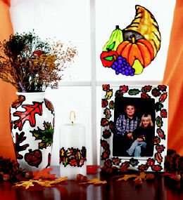 | PREPARATION 1. Tape patterns to underside of Styrene Painting Blanks. 2. Trace outlines and black areas of shapes with Black Leading by squeezing bottle and slowly moving hand along pattern lines, holding tip slightly above surface. Let dry 1 to 2 hours. PAINTING INSTRUCTIONS NOTE: When filling outlined areas with paint, squeeze paint directly from the bottle and apply a line of paint inside the leaded outline, keeping paint at level of leading. Then fill in area by gently squeezing paint and moving tip side to side. Keep bottle tip slightly above surface. CORNUCOPIA 1. Fill horn with Root Beer Brown. Add White Chocolate to left of center and use toothpick to pull white lines through brown to make highlight. 2. For pumpkin, make lines of Christmas Red along seams and Primary Yellow lines at top of each section. Fill remainder of pumpkin with Orange Lollipop. Stem is Root Beer Brown 3. Fill squash with Primary Yellow. Add Leaf Green lines and pull color through yellow with toothpick. 4. Fill other shapes as follows: opening with Grey, pear with Primary Yellow, grapes with Great Grape and touch of Lively Lavender, apple with Christmas Red, leaves with Lemon Lime and Leaf Green. 5. Allow to dry 24 hours. Peel design and stick onto window or other smooth surface. VASE, PICTURE FRAME & CANDLE 1. Follow previous directions for applying Black Leading. 2. Fill acorns with Root Beer Brown and leaves with combinations of Primary Yellow, Orange Lollipop, Primary Red, Lemon Lime and Leaf Green. 3. When paint has dried for 24 hours, peel designs and stick smaller leaves to picture frame and candle, larger leaves and acorns to vase. |