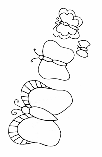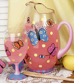 Ultra Gloss Acrylic Enamels provide a durable, high-gloss finish to almost any hard surface, and they are safe, easy-to-use and non-toxic. There are 36 colors plus a clear medium to create soft tints and durable glazes. Transferring Patterns Lay tracing paper over pattern and draw the basic lines. Lay this tracing on the surface to be painted. Slip graphite paper between the tracing and the surface. Tape to secure. Trace with a pencil to transfer the design. Do not trace details until after basecoating has dried. Preparation Clean glassware with vinegar and water. Dry thoroughly. Painting Instructions 1. Tape patterns inside glass as desired. 2. Paint large butterfly wings Country Blue with top border of Baby pink and body Gloss Black. Outline wings with liner and Gloss White, stripe pink area and do antennae with Gloss Black. Use pouncer handle tip to dot flowers with Lemon Yellow and Royal Fuchsia and wing edges with Gloss Black. 3. Paint medium butterfly wings with Royal Fuchsia and crosshatch with Baby Pink, using liner. Use pouncer handle to dot Lemon Yellow. Paint body and antennae and do outlining with Gloss Black. 4. Paint small butterfly wings Lemon Yellow. When dry, paint inside wings with Orange. Use liner to stripe Lemon Yellow edges with Gloss White. Paint body and antennae, and do outlining with Gloss Black. 5. Paint tiny butterflies Country Blue or Royal Fuchsia, stripe with Gloss White and outline with Gloss Black. Use pouncer to apply Lemon Yellow dots. Paint bases Country Blue with Royal Fuchsia stripes, pitcher handle and glass stems Baby Pink. |