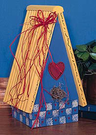 Patio Paint is a self-sealing exterior paint. no prior preparation is needed when working on wood. For other surfaces, follow directions on label. Patio Paints may be used on all porous surfaces such as concrete, terra cotta, wood, plaster, etc. Because of the self-sealing agents, they do not require a varnish upon completion. Painting Instructions 1. Paint roof Sunflower Yellow with the #10 flat brush. 2. Paint birdhouse sides and bottom Light Waterfall Blue with #10 flat brush. Let dry. 3. Dip sponge into water and squeeze with a paper towel until almost dry. Dab sponge into Daisy Cream and apply three rows of checkers around base of birdhouse. 4. Paint wood heart Patio Brick with #10 flat brush 5. To paint hearts: Dip brush handle into Patio Brick and place two dots of paint side by side. Drag brush handle down center of dots to form bottom of heart. Apply small hearts in the blue squares. Allow to dry. 6. Use Sharpie pen to outline checks and make squiggle lines on wood heart and roof trim. Finishing Instructions 1. Tie strands of raffia into a bow. 2. Use hot glue gun to attach raffia to roof and wood heart to front of birdhouse. |