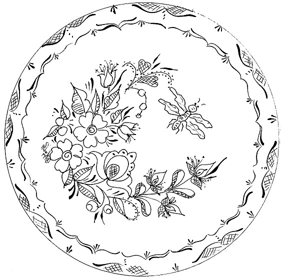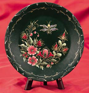 pattern lines. Allow to dry. Painting Instructions General: Basecoat with indicated color using Sure Stroke brush. Shadow or Highlight is a tiny dot of color; while it is still wet, use liner to pull out thin lines. 1. Leaves: use Sure Stroke to basecoat with Jade Green. Shadow is Evergreen, and highlight is Snow White plus a touch of Jade Green. 2. Pink Petals or Berries: Using Sure Stroke, basecoat with with Raspberry Pink. Shadow is Deep Burgundy, and highlight is Snow White. 3. Red Petals or Berries:Basecoat with Sure Stroke and Country Red. Shadow is a brush-mix of Deep Burgundy and Deep Midnight Blue. Highlight is Brilliant Red. 4. Dragonfly detail is painted with Glorious Gold and liner brush.Wings are a wash of Snow White. Wing pattern design is thinned Deep Burgundy. 5. When everything is dry, reapply Glorious Gold where needed. Randomly alternate strokes with Finer liner and script liner brush. 6. Using Fine Liner, trim edges with Glorious Gold for dark area, and Champagne Gold for lighter area. 7. Use Factis eraser to remove excess pattern lines. You will have to use pressure. Finishing Instructions Apply two coats of Dura Clear Gloss Varnish; allow drying between coats. |