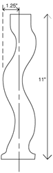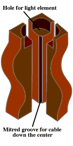 The stem of each lamp is made up of four pieces of oak (cherry would work just as well), 11 inches high, 1 1/4 inches wide and deep. Firstly, number the four pieces of wood and remember the order in which they are put next to each other, thus forming a larger square of 2 1/2 inches wide and deep. Using the template (see diagram on right) sketch the design onto each block. To do this, fold the template in half along the dotted line and position this over the block so that the design can be sketched onto two sides. Before cutting, check that when the four pieces are placed together, the result is the same as the template (i.e. the curved shape that the final lamp should display). To cut the each of the four blocks of wood use a jigsaw, and try to be as accurate as possible with the cuts (the more accurate you are now, the less sanding must be done later). Use a thin jigsaw blade and workl along the length of the wooden blocks very slowly. Do not discard the waste wood, as this is useful in the clamping stage. Once each block of wood has been cut, there will be one corner edge of each piece that displays no sign of a curve. This is the edge that is the center of the lamp. At this point, it is necessary to make a slot for the electrical cable to fit through from top to bottom. To do this, chamfer an angle off the central edge of each of the four blocks (see diagram two). When the four blocks are placed together there will be a neat, square hole running all the way down the middle of the lamp. Glue two of the shaped blocks together - forming a "double block" that is 2 1/2 inches wide by 1 1/4 inches deep - using a good quality wood glue, and clamp for several hours. Note that it is important to ensure that the flat side of the clamped block lines up smoothly, as this is what the second "double block" will be glued to. As the blocks are curved, it can be difficult to use clamps. However, if the previously discarded waste wood is used to fill the curves, this issue is easily resolved. Repeat this gluing process on the remaining two blocks.