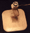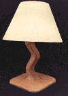 Finally, when both double blocks are securely glued, glue the two halves together, thus forming the final shape of the lamp stem. At this point, the top of the stem should have a 1 1/4 inch diameter hole drilled in it, to an approximate depth of one inch. This hole will house the light bulb electrical element (the item into which the light bulb is screwed). Once this is done, sand the stem using coarse, medium and fine grade sandpaper, until the stem is suitably smooth. Base constructionThe base is almost an anticlimax after the rest of the project. Cut a piece of wood 8 1/2 inches square and 3/4 inch deep and mark the center of this lamp base by drawing a line from corner to corner, thus forming an "X". Place the finished lamp stem over the center of this "X", and draw around it carefully, thus marking the size of the hole needed to be cut in the base piece. Again, this can be cut out using a jigsaw. However, be careful not to cut out too much as the resulting hole should be a tight fit around the stem. To ensure this tight fit, make the first cut one sixteenth of an inch inside of the pencil markings, and then expand this cut outwards if necessary. Once the hole is a satisfactory fit, all that is left to do is to miter the base to the design of your choosing, rather than leaving is as one big block. On the lamp shown above, the miter cut down to a depth of 1/2 inch at each side, leaving the center as the full height of 3.4 inch. This in turn was sanded down to a smooth curve when the base was sanded. On the underneath of the base, cut out a rough groove from the center hole the one edge of the base. This groove is used to run the wire along from the stem to the edge of the lamp. Note that the edge chosen should be to poorest of the four edges, as this will be the back of the lamp. Putting it all together