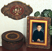 Finish Instructions Basecoat with Deep Burgundy. Allow to dry. Use a damp sea sponge to dab Emperor's Gold over the piece. Remove excess color with a sponge. Allow to dry. Apply Heavenly Hues Soft Black to surface. Use a clean, damp sponge to blot the color away. To finish, use Gloss Spray Sealer. Wall Plaque 1. Paint the front Deep Burgundy and the edges Lamp Black. The routered edge is Emperor's Gold. Apply Heavenly Gold to curved edges and wipe back with a damp sponge. 2. Apply faux finish as described above. 3. Draw an oval in the center of plaque. Paint inside of oval with Deep Burgundy. Allow to dry. Outline oval with Emperor's Gold. 4. Rose Basket(separate plaster piece): Allow color to fall into cracks and crevices. Wipe back desired amount with a damp sponge. If too much is removed, re-apply color. Apply Earth Brown to basket and wipe back. Allow to dry. The bows are Misty Mauve. The large flower in the center and two buds on the sides are Moon Yellow. Remaining buds and flowers are Beautiful Burgundy. Leaves are Hunter Green. Wipe each color back as desired. Drybrush piece with a minimum amount of Heavenly Gold. Attach basket to center of the plaque with craft glue. Papier Maché Box (uses colors listed in faux finish instructions) 1. Paint the lid and box Deep Burgundy. The edge of the lid is Lamp Black. Apply faux finish as described to the box lid (top only) and the box. 2. Draw a circle in the center of box. Paint inside of circle with Emperor's Gold. Allow to dry. Wooden filigree: Paint the piece Deep Burgundy. The center is Lamp Black and the petals are Emperor's Gold. Apply Soft Black over the entire piece and wipe back. Apply Heavenly Gold over center and wipe back. Glue piece to center of lid. 3. The brush stroke border is Emperor's Gold. Frame (uses colors listed in faux finish instructions) 1. Paint the frame Deep Burgundy. Allow to dry. 2. Measure 1/4" out from the opening and mark with chalk. Place tape along chalk marks. 3. Apply faux finish as described to the outside edge of the frame. Remove tape. 4. Measure out a border and paint Emperor's Gold and Deep Burgundy. (Refer to photo). |