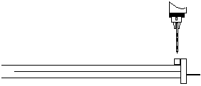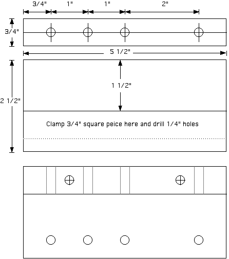 This jig requires one piece of hardwood 3/4" square X 5 1/2" inches long and one piece 3/4" X 2 1/2" X 5 1/2" long. Mark off the 5 1/2" long piece as shown below, clamp it to the 3/4" X 2 1/2" piece, 1 1/2" from the top edge and drill the four 1/4" holes. It would be best to use a drill press for this if possible as the holes should be square.