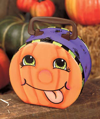 No-Prep Metal Paint is a non-toxic paint that has good adhesion to most metal surfaces, including galvanized metal, tin, brass and wrought iron,without using a coat of primer. It is available in 35 colors and a Clear Medium. All 35 colors are intermixable. Transferring Patterns Lay tracing paper over pattern and draw the basic lines. Lay this tracing on the surface to be painted. Slip graphite paper between the tracing and the surface and secure. Trace with a pencil or stylus to transfer the design. Do not trace details until after basecoating has dried. Preparation Clean lunch box with 1:1 mix of vinegar and water; dry. Painting Instructions 1. Using a 1" flat brush and Bright Orange, paint front and back of box. 2. Paint small bands on sides with Coal Black, using #10 flat brush. Middle band is Fresh Lavender and handle is Espresso Bean. 3. Using #12 flat brush and Bright Lime Green, paint stripes on black side bands. Add a line of Bright Yellow on either side of green stripes. 4. Shade* lines on pumpkin faces with 1:1 mix of Sedona Clay and Clear Medium, using #12 flat brush. Highlight faces with 1:1 mix of Bright Yellow and Clear Medium. 5. Trace and transfer face patterns. Paint eyes, nose and mouth of smiling face with Coal Black and Bright Yellow. 6. On the other face, use #10 brush to paint eyes Bright White, irises Bright Lime Green and pupils Coal Black with Bright White highlight. 7. Load brush with Clear Medium, then pick up Sedona Clay on one corner of the brush; blend on palette and shade around nose, eyes and tongue. 8. Paint tongue Light Apricot; shade tongue, top of nose and cheeks with Deep Fuchsia and Clear Medium, loading brush the same as in Step 7. 9. Outline faces with Coal Black, using 5/0 liner. 10. Paint randomly spaced black circles on purple band for spiders. Use liner to paint legs. Add Bright Yellow eyes, using handle end of brush. Techniques * Shading: Use the floating method, dipping the brush into water or Brush ‘n Blend Extender. Lightly press on a paper towel until sheen leaves the bristles. Dip one corner of brush into paint; stroke back and forth on palette, blending until the color spreads evenly halfway across the width of the brush. |