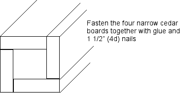 Cut two 12" lengths from the cedar fence board, rip them in half, then rip them to 2 1/2" wide, cut the base to size from the remainder of the board, sand the ends and sides and surfaces of all pieces. Assembly