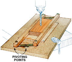 To set up the jig, lower the bit so the tip is trapped between the wooden sides. "Squeeze" the rectangle onto the drill bit and clamp the MDF board to the drill press table. The drill bit will be centered on any piece held by the jig.