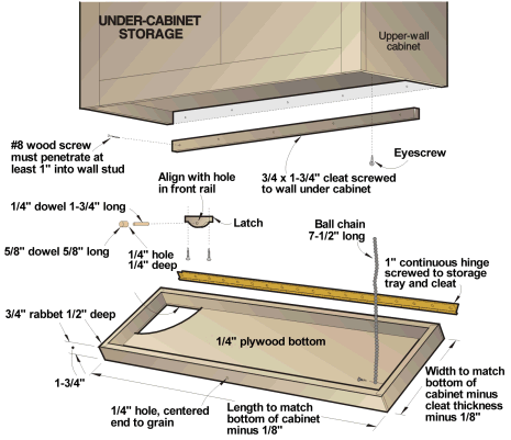 the cabinet minus 1/8" for clearance. The width of the tray must equal the