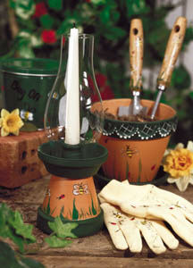 Terra Cotta Pieces 1. Basecoat saucers and rims of pots with Pine Green. 2. For grass, double load #8 shader with Pine Green and Fiesta Yellow. Start at the bottom of the pots, using the flat of your brush and pull up to the chisel to make the blades of grass around the pot. Use the chisel only for some fine blades of grass. 3. Basecoat bee bodies with Fiesta Yellow. Basecoat head with Wrought Iron Black. Using liner, add black squiggle lines for the stripes on the body. With #8 shader, float two Cloud White “c” strokes on each side of the body for wings. Let dry. Line the wings with thinned Wrought Iron Black. Add small comma strokes for antennae. 4. Basecoat ladybug bodies with Geranium Red. Basecoat head with Wrought Iron Black. Using liner, split the body of the flying ladybugs and fill in a small “v” at the bottom of the body with Wrought Iron Black. Add black dots with stylus and small comma strokes for antennae. 5. For lace border on large pot, use 3/4" wash brush corner loaded with Cloud White to float large “c” strokes around rim. Make crosshatches with thinned Cloud White and liner. Add dots around curve with wooden end of brush and a fresh puddle of Cloud White. 6. If desired, coat terra cotta pieces with Clear Coat for added protection and shine. Tools Paint bugs and grass on handles, following instructions above. Add Wrought Iron Black “fly lines,” if desired. Gloves Follow instructions for bees and ladybugs, using SoSoft colors in place of Patio Paint. Add black “fly lines,” if desired. Candle Bucket Follow instructions for bees and ladybugs, using No-Prep Metal Paint colors in place of Patio Paint. Add Coal Black “fly lines” and lettering, if desired. FINISHING INSTRUCTIONS Paint candle cup Pine Green and glue in the center of the 4" saucer, then glue saucer to the bottom of the 4" pot. Add glass hurricane. |