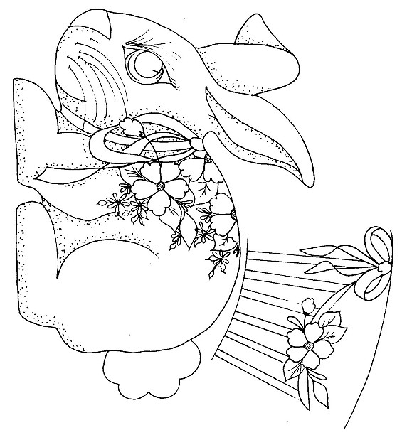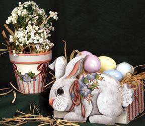 line around pot. Painting Instructions Note: When floating color with Patio Paint, use Clear Coat for the medium in the brush instead of water. Terra Cotta Pot 1. Paint above ribbon line Daisy Cream. Paint below line with 2:1 mix Daisy Cream and Concrete Grey. 2. Transfer details of pattern when dry. 3. Paint stripes Foxglove Pink with Daisy Cream dots. Paint leaves with 2:1 mix Fiesta Yellow and Pine Green. Shade leaves behind petals, where one lies behind another and bottom edge Pine Green. Highlight top edge with Fiesta Yellow. Outline and add veins with Pine Green. 4. For flowers, use #8 flat brush filled with Concrete Grey and corner load with Deep Waterfall Blue. Form each petal, keeping Deep Waterfall Blue to outside edge. Centers are Patio Brick dotted with Fiesta Yellow. Ribbons are Patio Brick. Shade where ribbon turns or where it lies beneath something with Woodland Brown. Highlight widest areas by drybrushing Daisy Cream. 5. Paint pot rim with grey mix and add two stripes with Foxglove Pink. Bunny Crate 1. Mix two parts Daisy Cream to one part Concrete Grey and paint crate and bunny. Mask off 1/2” stripes on both ends of crate with tape. Paint stripes Foxglove Pink. Shade each side of stripes Patio Brick and add dots of Daisy Cream. 2. Transfer pattern on bunny, omitting flowers. Paint inside ear and nose Foxglove Pink. Shade inside ear and underside of nose Patio Brick. Shade as shown on pattern with 2:1 mix Concrete Grey and Wrought Iron Black. 3. Use dry deerfoot brush to tap in dark grey mix over haunch, back of front leg, top of ear, back and muzzle. Paint tail dark grey mix and tap in Cloud White. Further shade Wrought Iron Black around haunch, front leg and muzzle. Paint eye Cloud White. Bunny has Woodland Brown eye with Wrought Iron Black pupils. Highlight with Cloud White. Shade Wrought Iron Black just inside upper lid. Outline eye and add whiskers and lashes with Wrought Iron Black. 4. Transfer pattern for flowers. Refer to pot for bow, large flowers and leaves. Fill #4 flat brush with Foxglove Pink and corner load with Patio Brick. Keep Patio Brick to the outside tip and use chisel edge of brush to make each petal. Centers are Fiesta Yellow. Glue bunny to front of crate. |