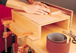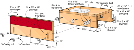 The 12x18" platform supports the piece while you guide it against sandpaper attached to a fence. Three slots in the fence let you slide it up and down to expose fresh sandpaper as needed. Coarse paper is mounted on one side of the fence; the other side has finer paper. Sawdust falls into the space between the fence and platform.