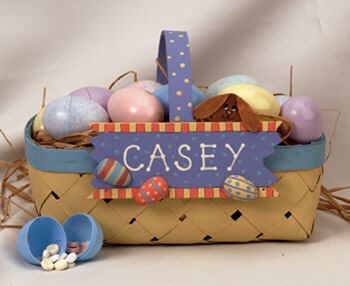 Americana Acrylics are artist-quality, water-based, non-toxic paints. They are intermixable and suitable for almost any surface. They are creamy to facilitate smooth and easy brush strokes, and highly pigmented for richer color and one-stroke coverage. The wide range of colors makes color coordination easy: It reduces the waste of mixing to get the perfect hue. Instructions 1. Use wash brush to paint basket sides and bottom Moon Yellow, basket border Salem Blue, handle and sign Country Blue. Paint Woodsie pieces Raw Sienna, 1 egg Coral Rose, 1 egg Salem Blue and remaining egg Moon Yellow. Let dry. 2. Use #4 brush to paint border on sign Moon Yellow. When dry, paint checkers on sign with Coral Rose. 3. Use #4 brush and liner brush to add details on eggs as desired or refer to photo. Use brush handle to dot Moon Yellow on basket handle and Salem Blue on sign. 4. Use marker to outline checks, and draw bunny face on Woodsie circle. 5. Use liner brush to paint bunny nose Coral Rose 6. Use liner to paint child’s name in block letters with Light Buttermilk. Dot letters with handle tip of brush. 7. Hot glue bunny and eggs on sign. Glue sign to basket. |